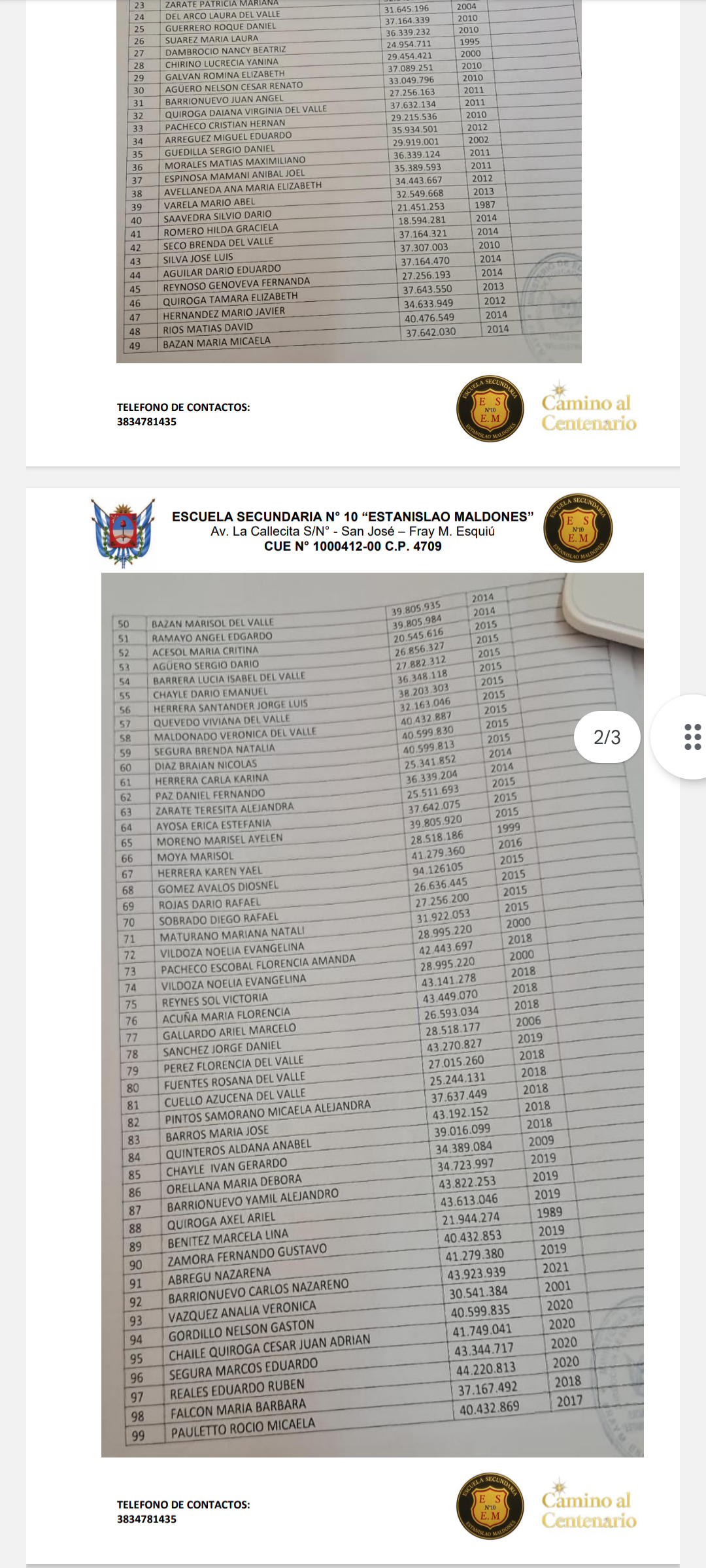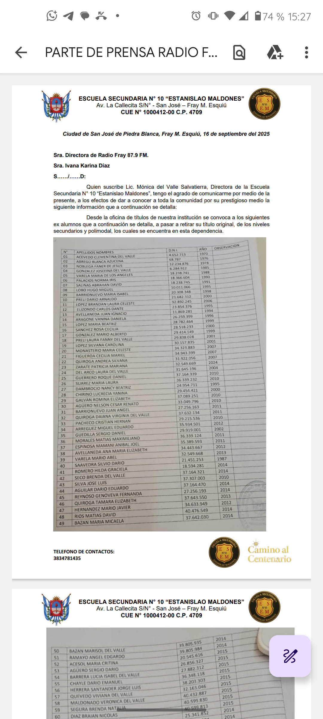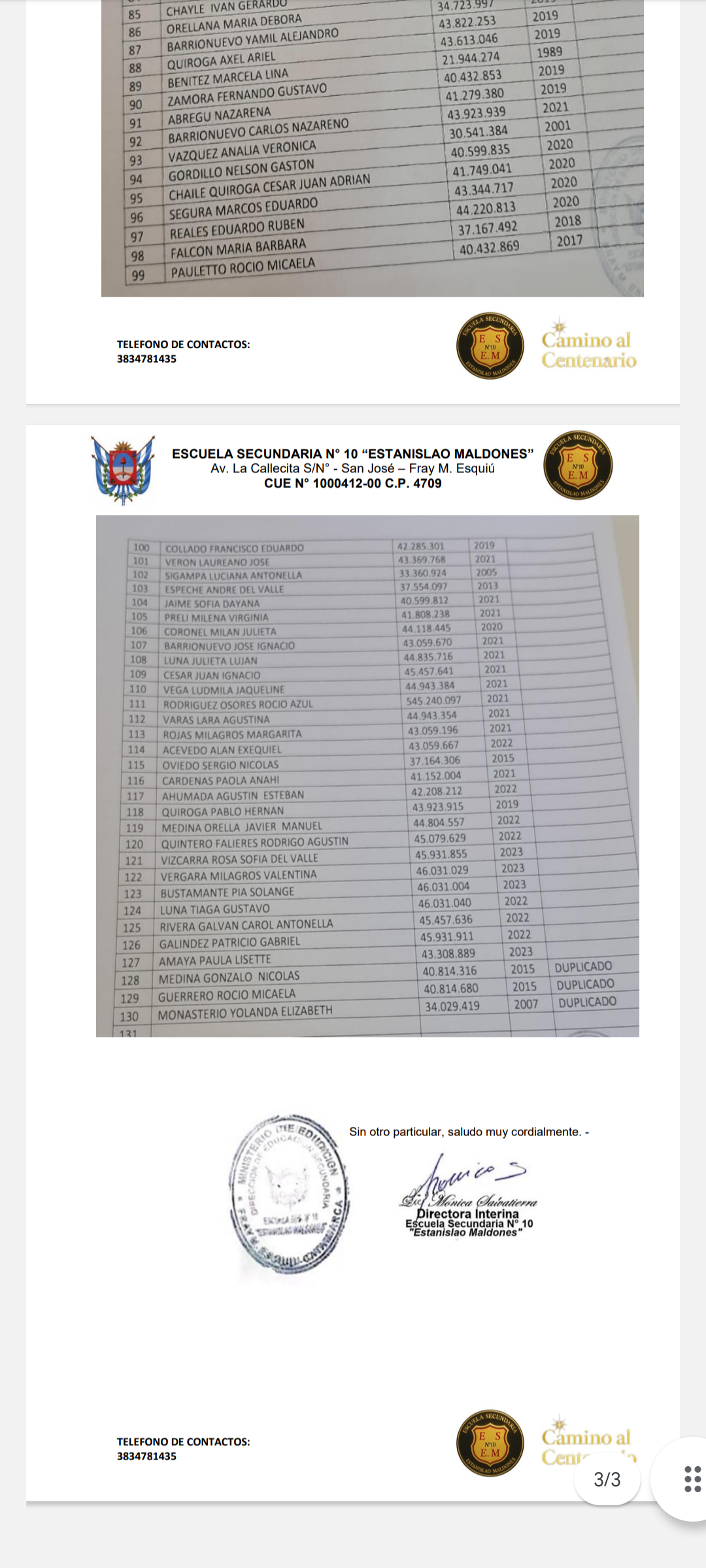 Quien suscribe Lic. Mónica del Valle Salvatierra, Directora de la Escuela Secundaria N° 10 Estanislao Maldones, tiene el agrado de comunicar por medio de la presente, a los efectos de dar a conocer a toda la comunidad por su prestigioso medio, la siguiente información que a continuación se detalla: Desde la oficina de títulos de nuestra institución se convoca a los siguientes ex alumnos, que se detallan a continuación, a pasar a retirar su título original de los niveles secundarios y polimodal, los cuales se encuentran en esta dependencia: