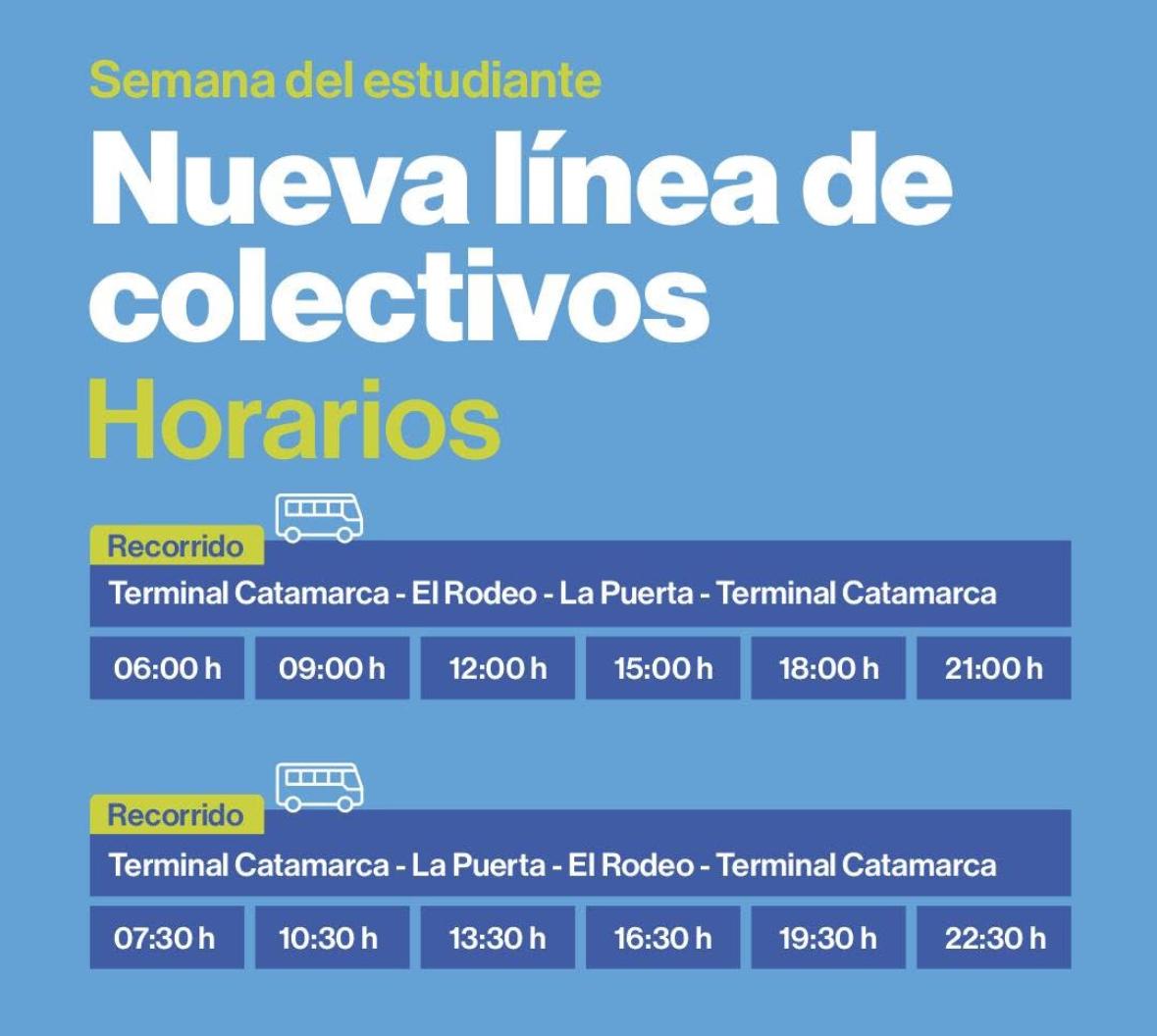 Los horarios de salida desde Terminal Catamarca – El Rodeo – La Puerta – Terminal serán a las 06:00, 09:00, 12:00, 15:00, 18:00 y 21:00 horas. Mientras que en el sentido inverso, Terminal Catamarca – La Puerta – El Rodeo – Terminal, los horarios establecidos son 07:30, 10:30, 13:30, 16:30, 19:30 y 22:30 horas.